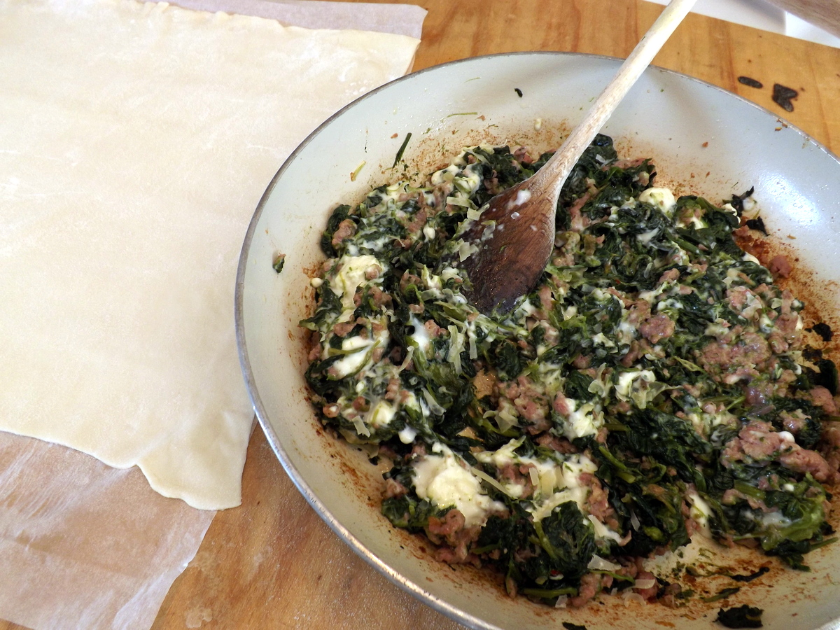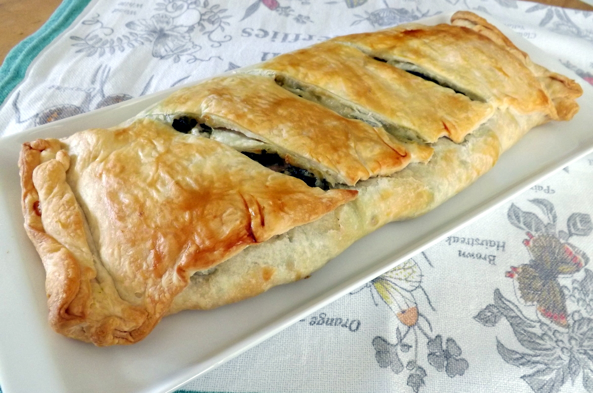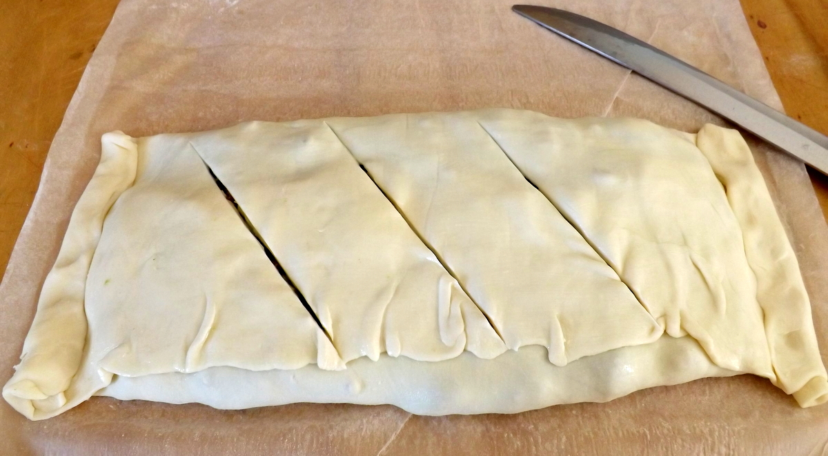Porre il composto al centro della pasta sfoglia, chiudere ripiegando e ripiegare anche i bordi.