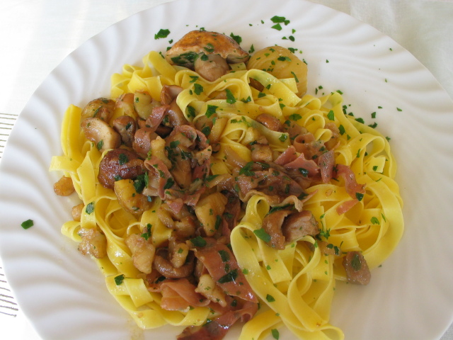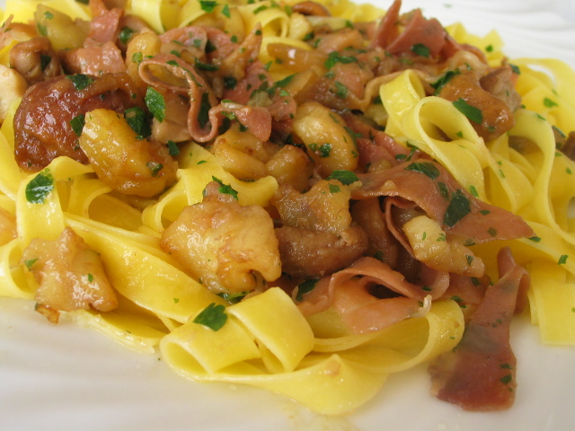 Cinzia,nella spiegazione della ricetta ho omesso di dire che dopo aver fatto appassire lo scalogno ed aggiunto i pezzetti di castagne ed i funghi,ho bagnato con acqua per portare a cottura (le castagne erano appena sbollentate e i porcini surgelati) e che era risultato un sughetto molto umido.Le tagliatelle,pasta delicatissima,non le ho scolate in modo "classico",ma tirate su dall'acqua con un colapasta delicatamente; Non ho saltato la pasta,cosa che con le tagliatelle non faccio