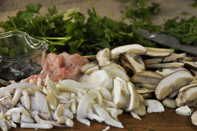Fase 1Pulisco bene la seppia e mentre la svuoto cerco di salvare almeno in parte la sacca del nero, scotto la seppia in pressione pochi minuti, la lascio raffreddare nella sua acqua e la affetto finemente: è ancora leggermente tenace; affetto i porcini, trito un po' di prezzemolo, pulisco l'aglio, pulisco gli scampetti, metto in una larga padella con olio di oliva e metto da parte