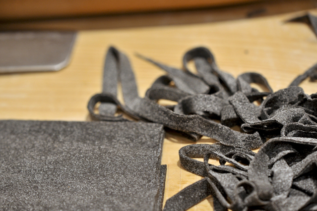 Fase 3Impasto 2 uova medie con 2 etti di farina, riesco a salvare poco meno di un chucchiaino di nero di seppia che aggiungo alla farina, infine aggiungo anche un paio di cucchiai di bisque di scampi e impasto, metto la pasta tra 2 piatti e lascio riposare una ventina di minuti, mentre aspetto preparo il condimento delle tagliatelle.