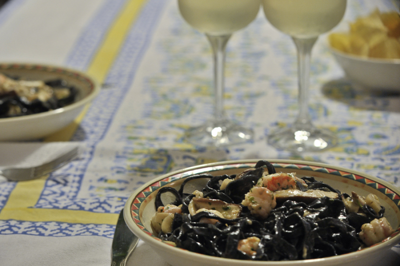 oggi ho preparato queste tagliatelle al nero di seppia, condite con porcini, seppia, scampi e bisque di scampi, per onorare il giorno dedicato ai nostri morti, una festa antica legata alla tradizione italiana molto più delle feste del giorno di ognissanti