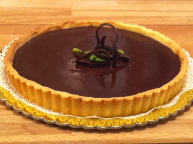 Cuocere in bianco una base di frolla stesa in strato sottile in una tortiera di 30 cm, prima imburrata ed infarinata. Non portare a termine la cottura. Far bollire la panna con il latte e versare il tutto sul cioccolato leggermente fuso. Mescolare bene con la frusta e aggiungere un uovo intero amalgamando bene il tutto. Versare la crema nel fondo di frolla ed infornare ancora a 120°C. La cottura è importante: la consistenza è quella di un budino. Io ho fatto cuocere finchè toccando con un dito la superficie della crema, si incontra una certa resistenza al tatto.