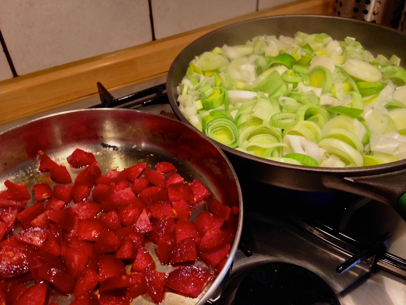 - Tagliare la salsiccia a pezzetti e rosolarla in padella come si fa con i lardons. Scolare e lasciar raffreddare.