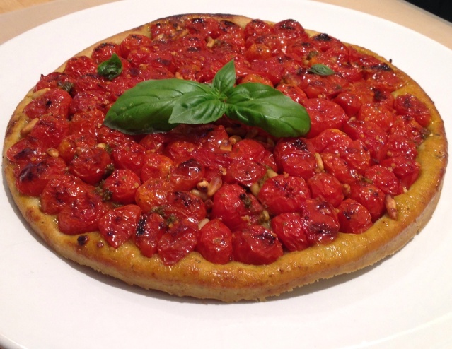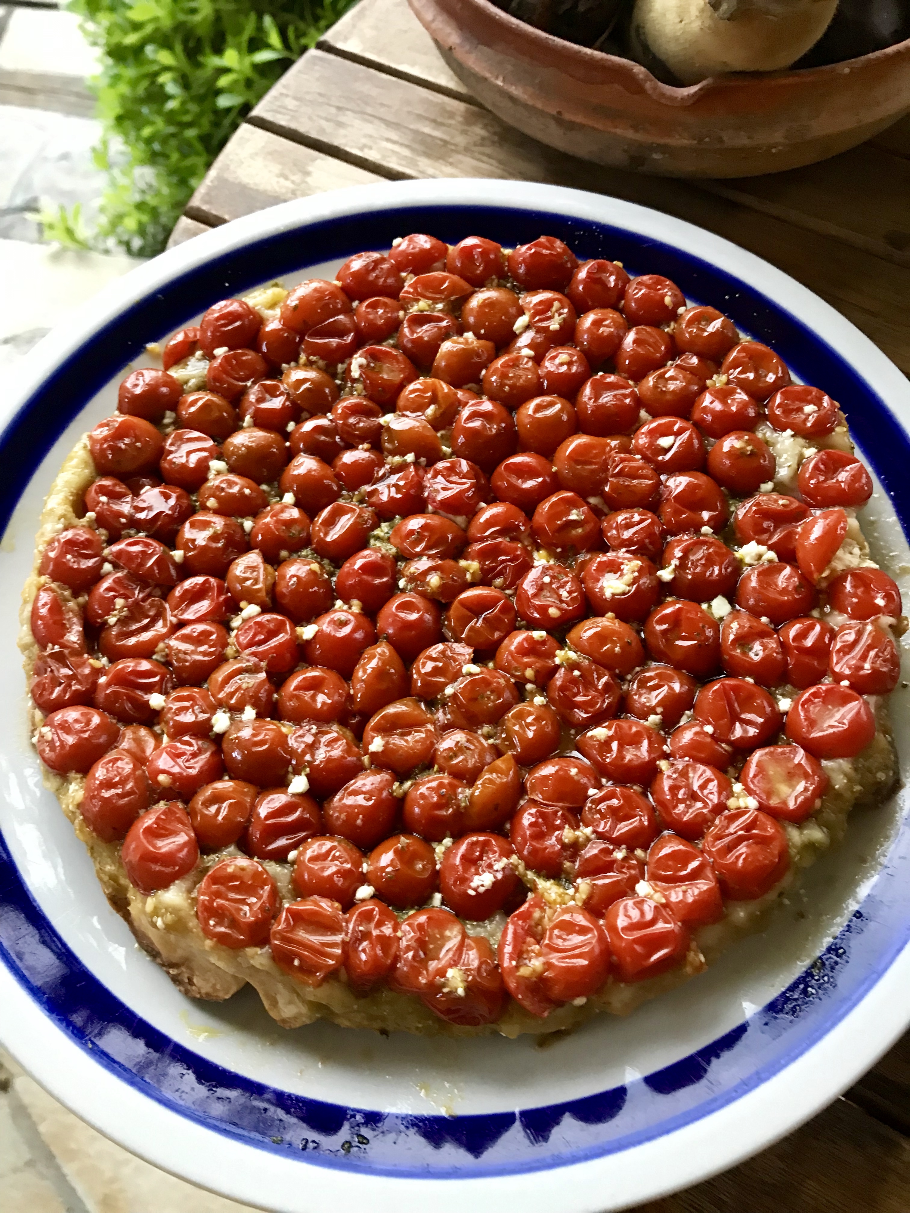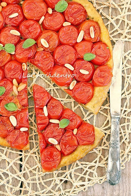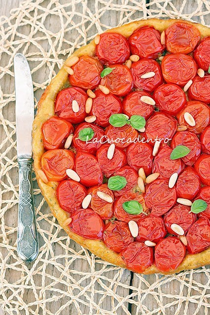 Stendete la pasta brisè ad uno spessore di 6/7 mm formando un disco poco più grande dello stampo, adagiatela sui pomodorini, premete leggermente e bucherellatela con una forchetta. Infornate ad una temperatura di 180° per circa 20 minuti.