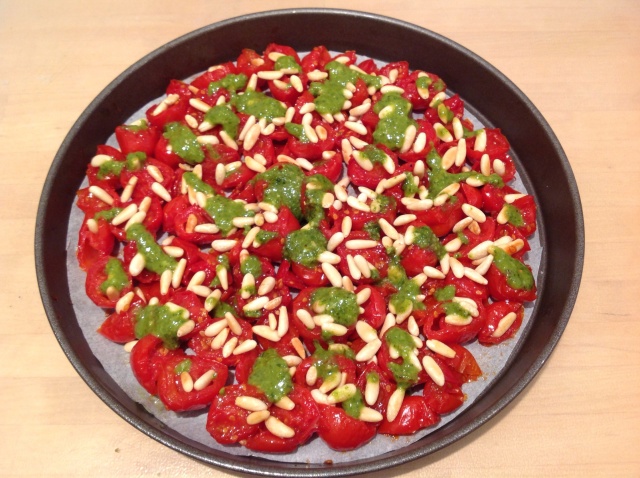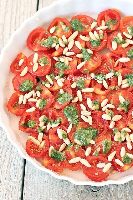 Adagiate i pomodorini con la parte recisa verso l'alto e cospargeteli con i pinoli ed il pesto.