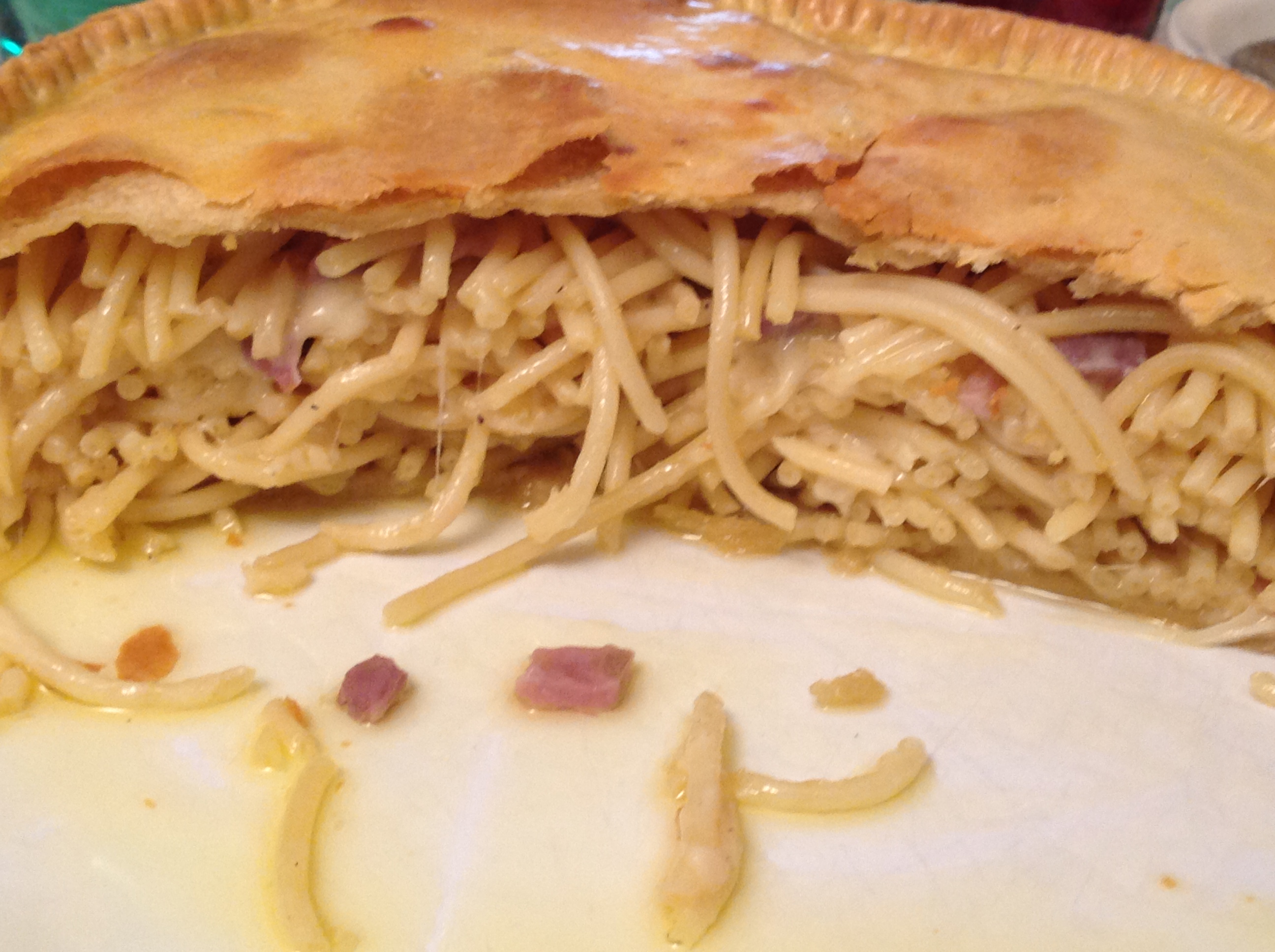 Con gli ingredienti elencati fare una pasta piuttosto soda (aggiungendo anche un po’ di acqua tiepida) , senza lavorarla troppo e lasciarla riposare per 30 min . Cuocere i bucatini al dente scolarli e condirli con 70 gr di burro, il parmigiano e lo svizzero grattugiati, il prosciutto tagliato a pezzettini, un po’ di noce moscata e pepe.