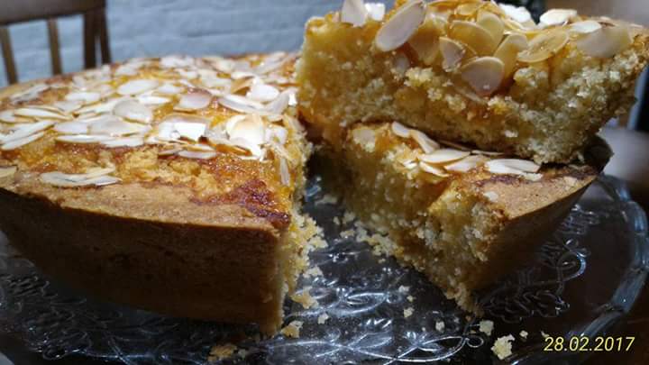 Imburrate e infarinate uno stampo quadrato e versateci il composto. Cospargetelo generosamente di mandorle a lamelle.