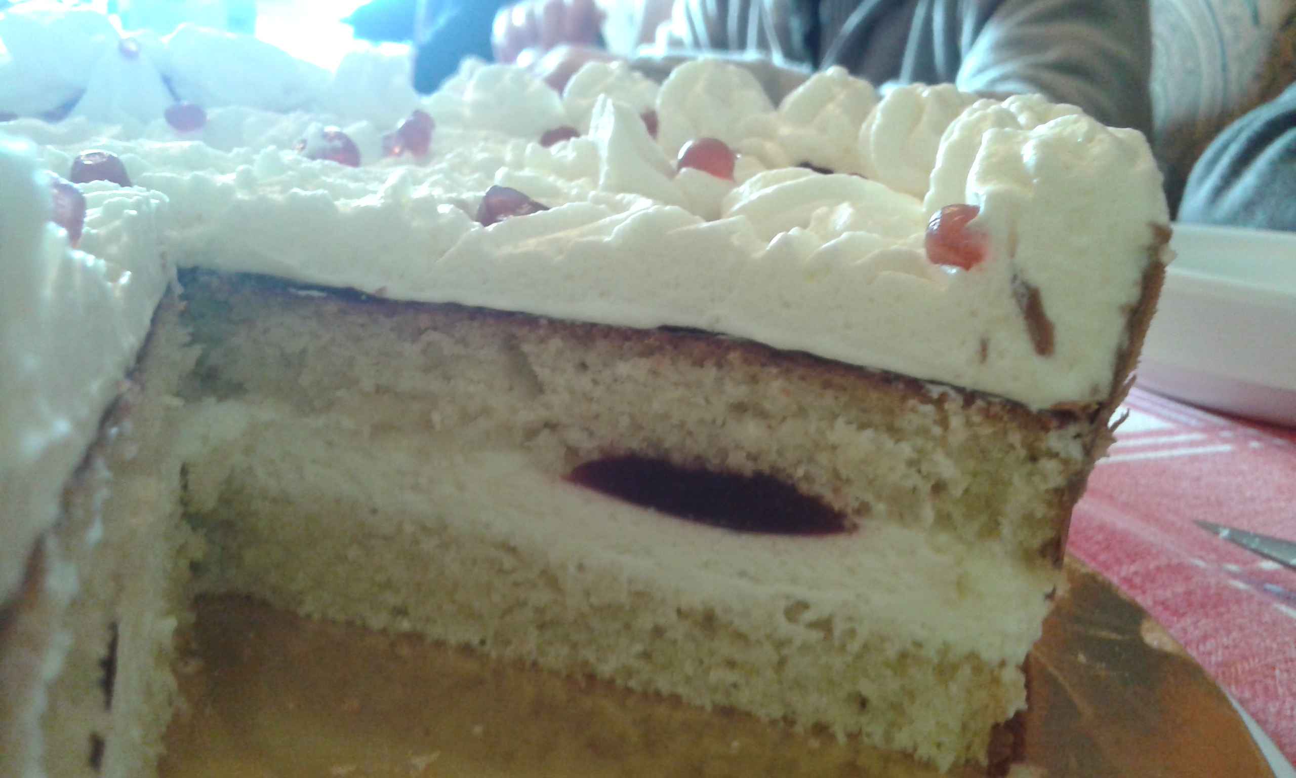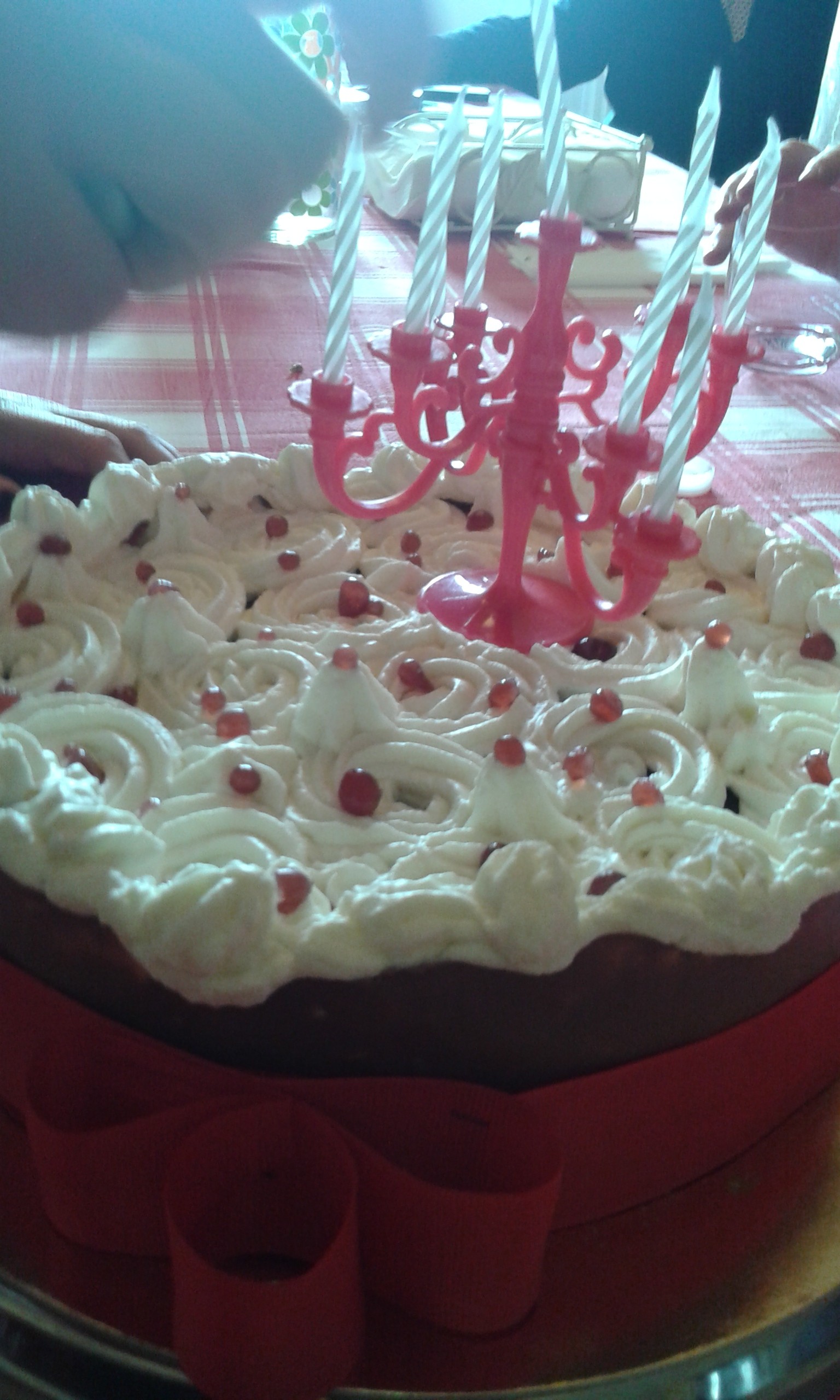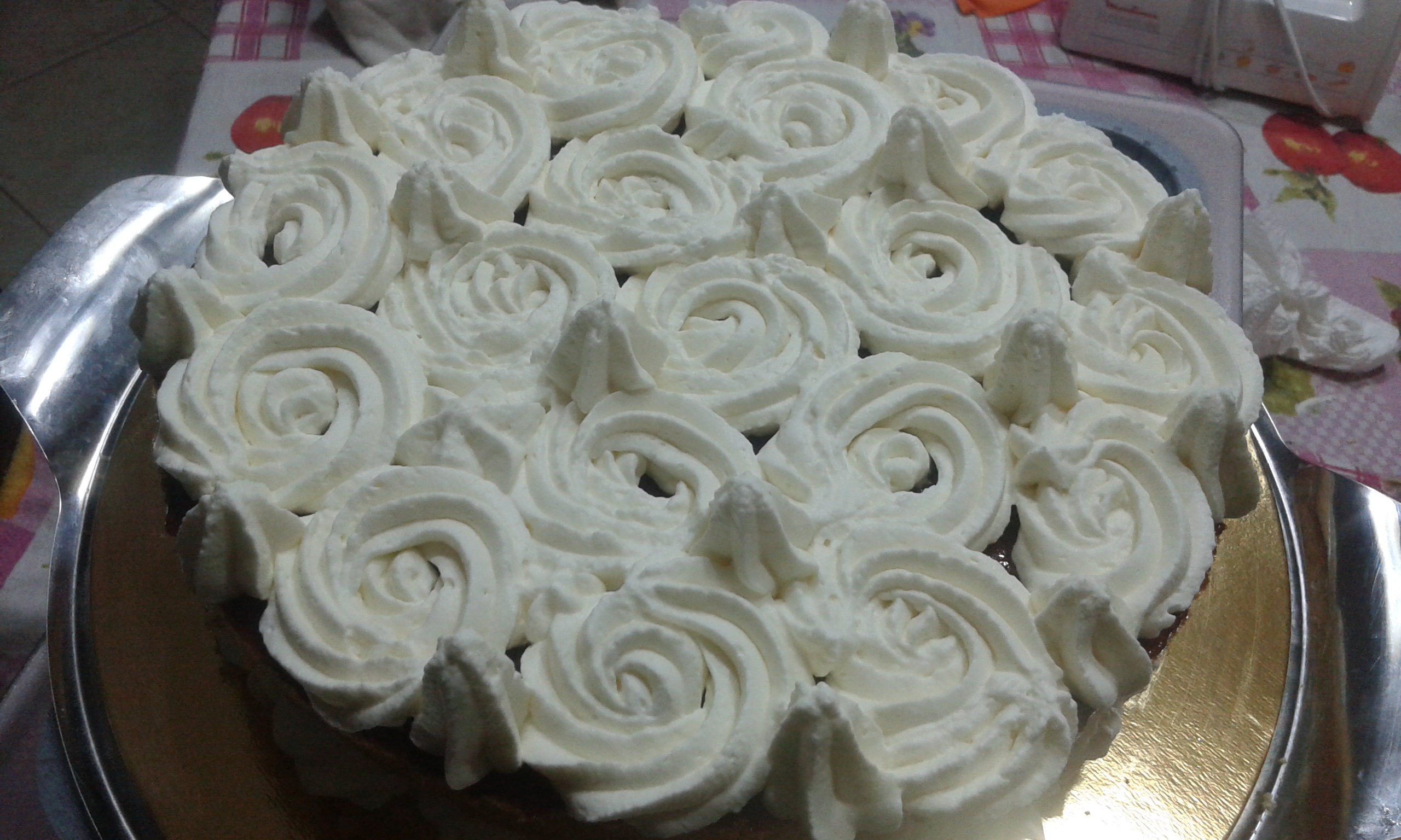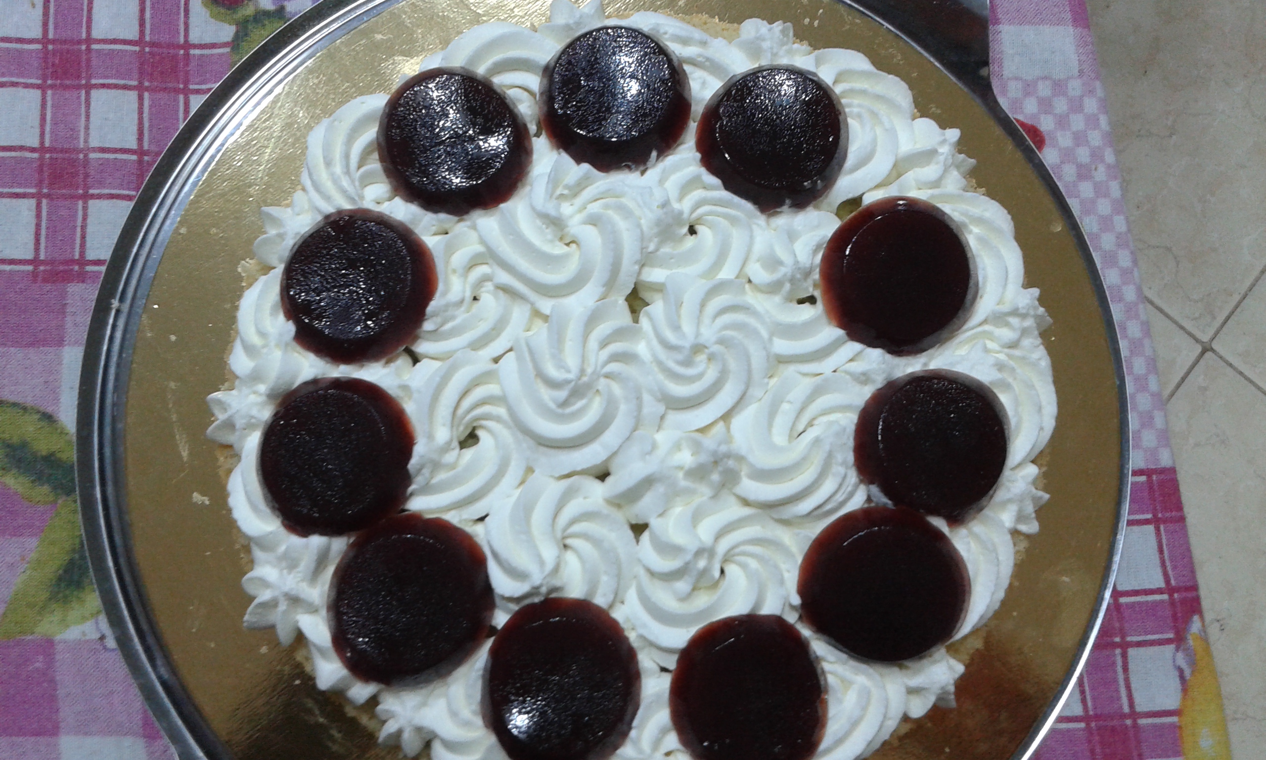 decorare con un altro strato di panna e con le perle di sciroppo di visciole.