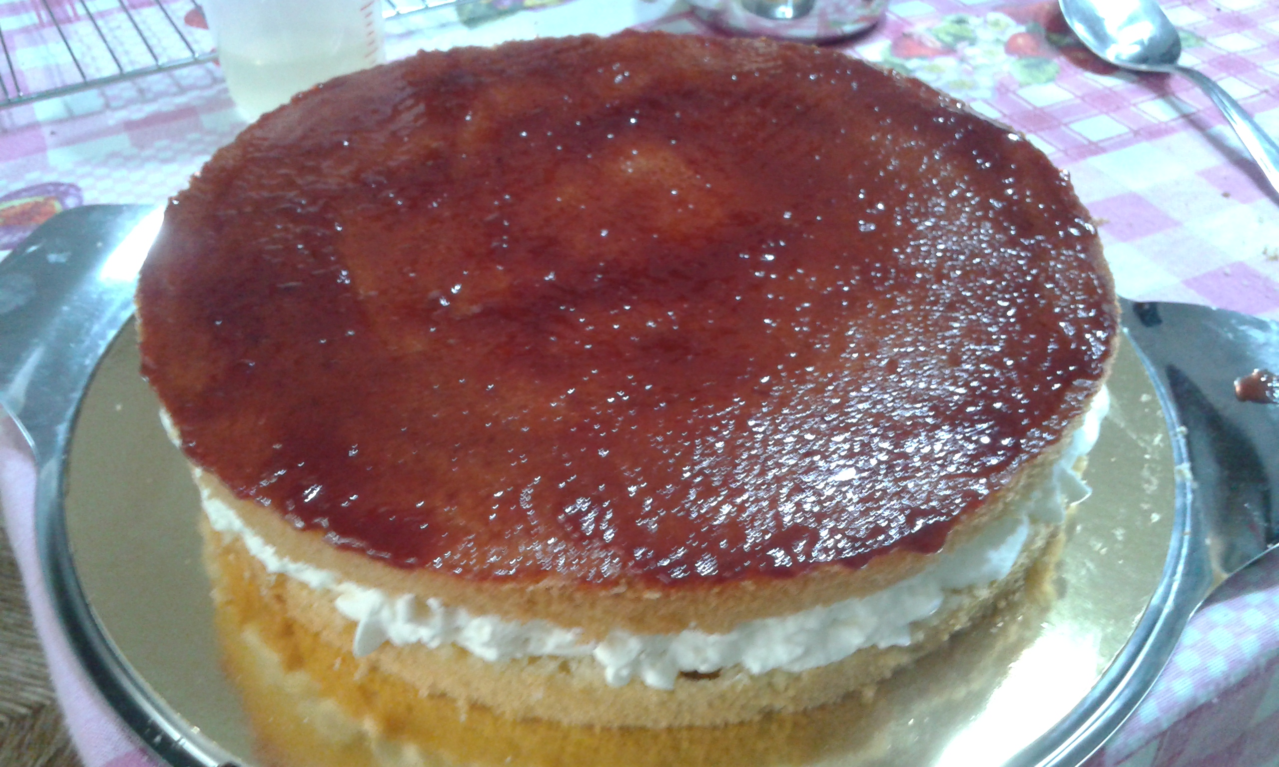 ricoprire con un altro strato di pan di spagna, bagnarlo e stendere sopra un po di gelatina di visciole (riscaldata, perchè con l'agar agar si solidifica subito).
