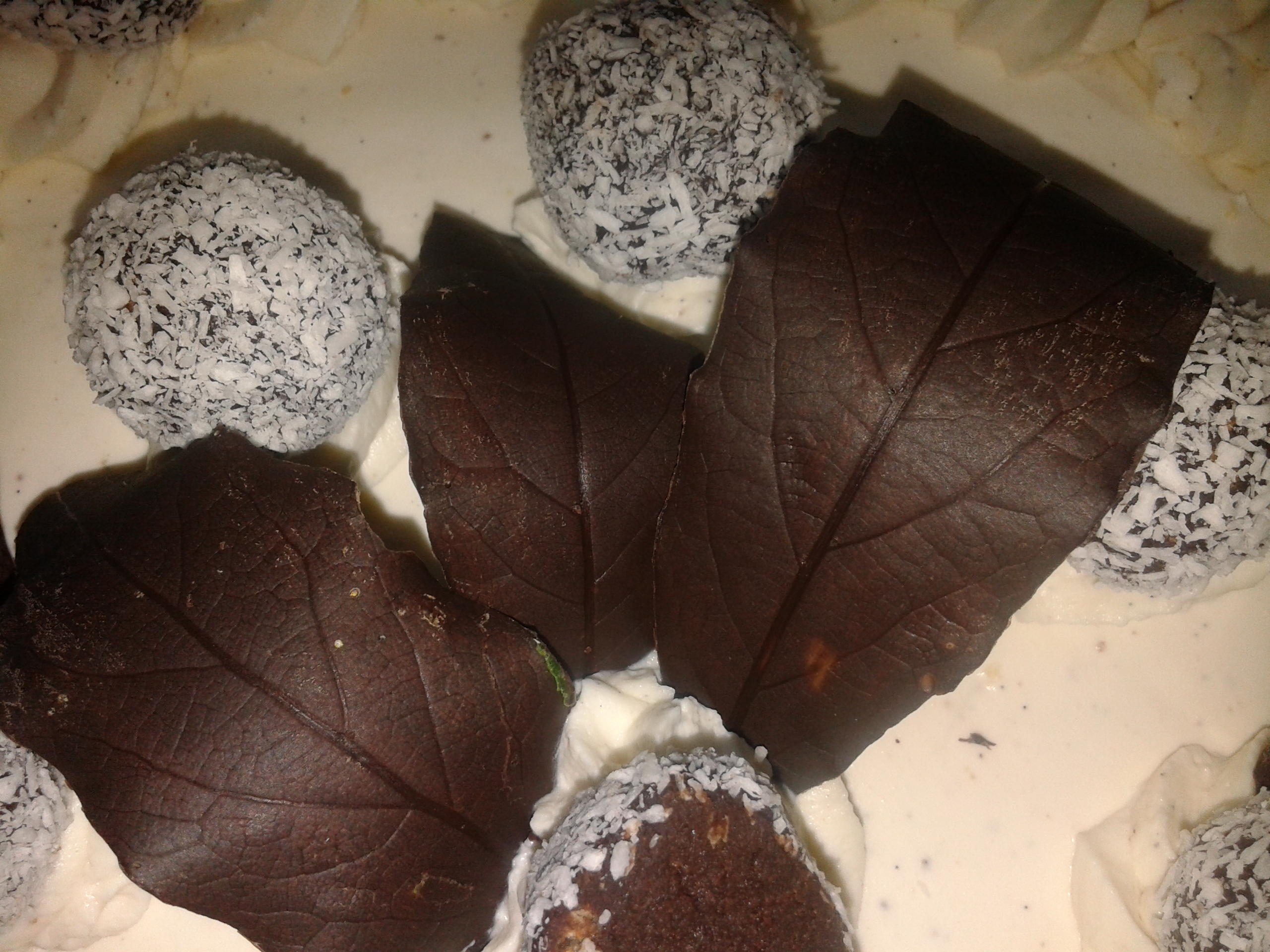 tutto intorno ho messo una fascia di cioccolato fondente di circa 3cm,fatta utilizzando una striscia di acetato su cui ho steso del cioccolato fondente fuso.