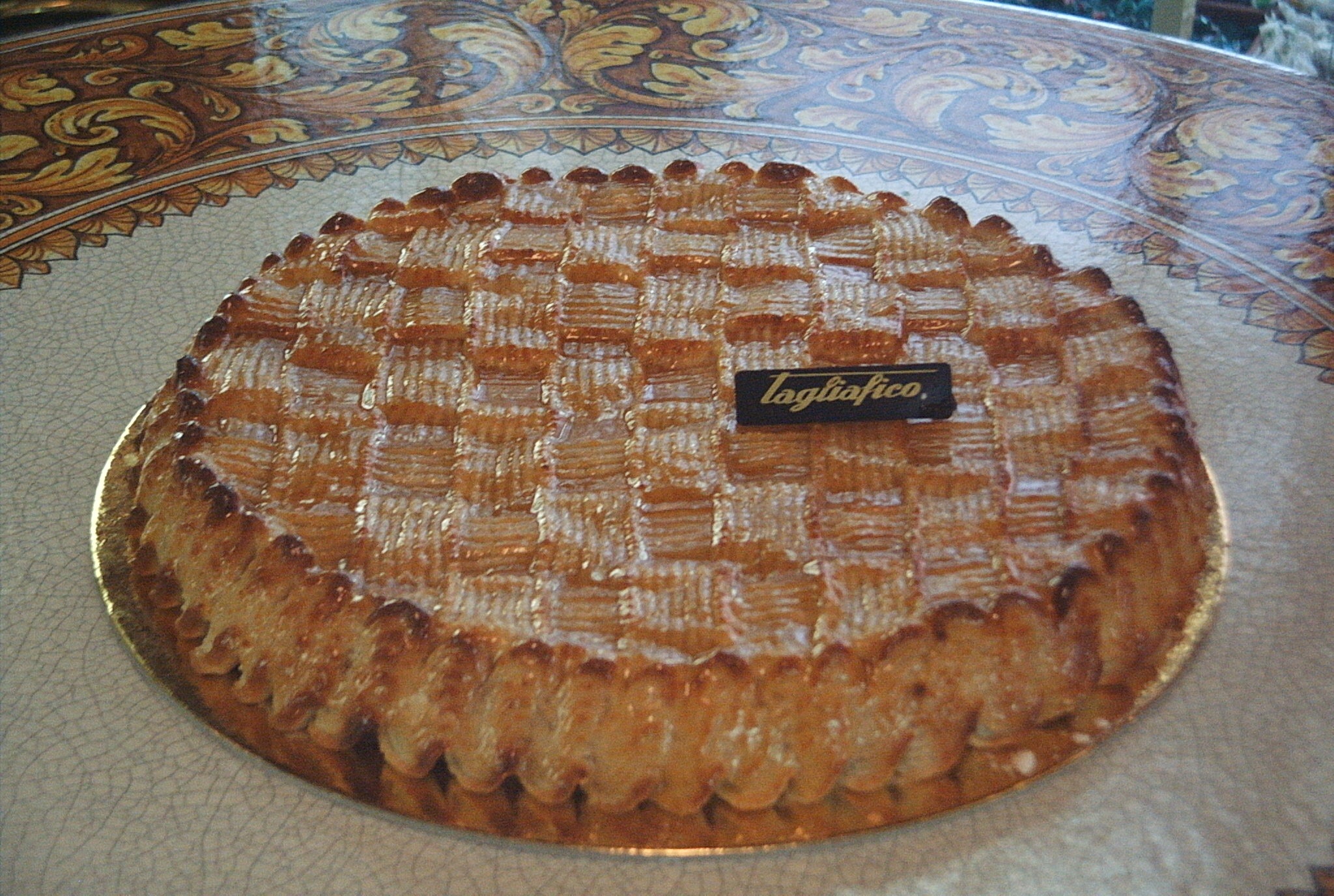 Tagliare il pandispagna in due dischi. Bagnare ciascun pezzo e procedere allla farcitura. decorare la torta con la pasta di mandorle per l'intreccio. Far riposare per un minimo di dodici ore, affinche' la pasta di mandorle si presenti con la consueta crosta. Cuocere in forno a 200-230°possibilmente dando il massimo calore al cielo del forno. Appena e' cotta decorare con gelatina di albicocche calda