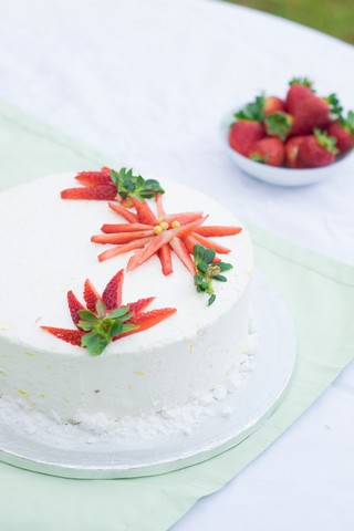 Decorate il dolce come più vi piace )io ho usato fragole e polvere di meringa). Tenete in freezer per sei-sette ore almeno prima di servirlo.