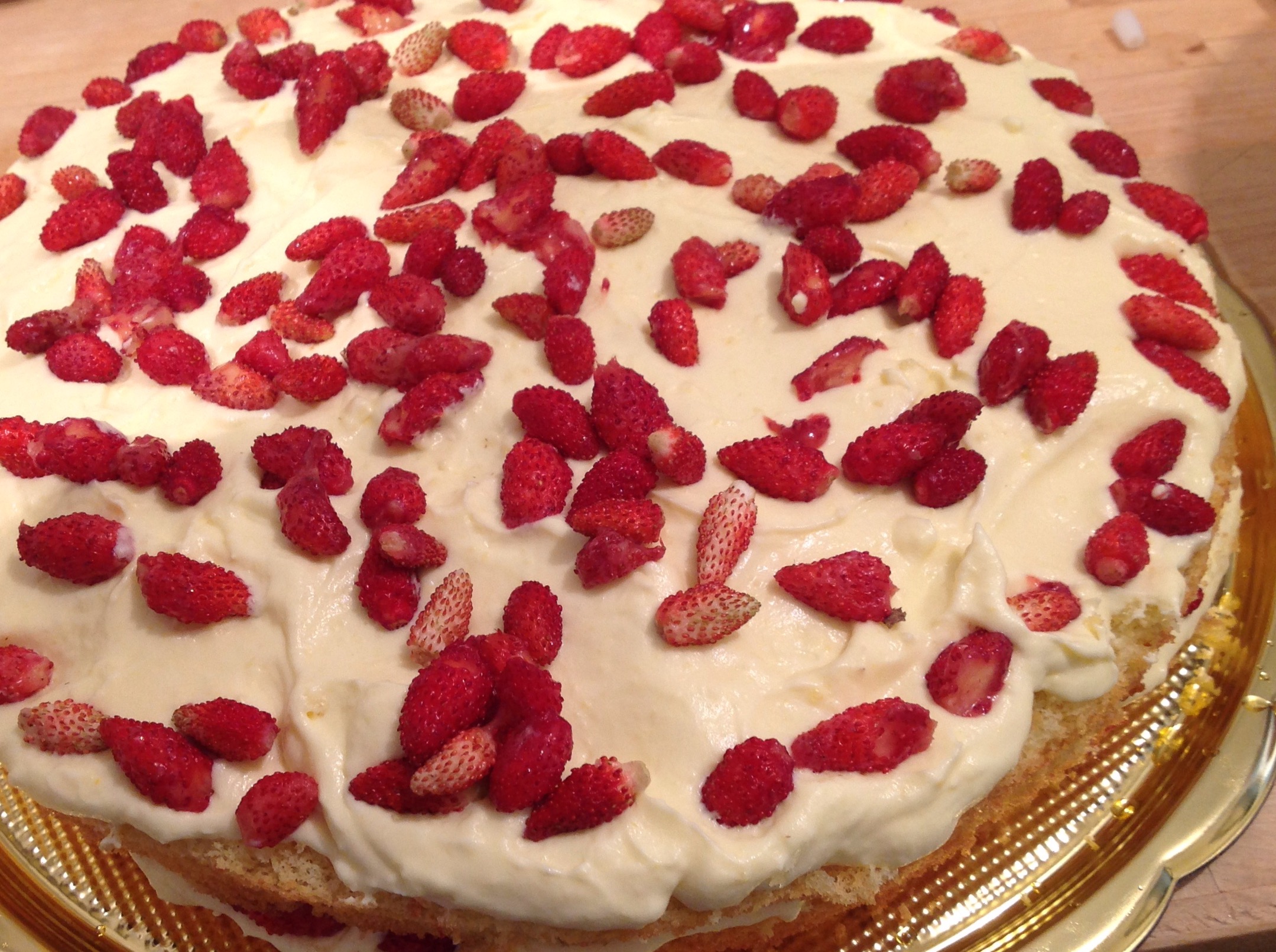 Il pandispagna è bene farlo in anticipo e surgelarlo (avvolgendolo nella pellicola), anche perché si taglia molto meglio. . Al momento di procedere all'assemblaggio, estrarlo dal freezer e pulire i bordi e la superficie inferiore a contatto del piatto di portata . Tagliare e formare tre dischi di uguale altezza e bagnarli in modo circolare , spalmare la crema e mettere le fragoline . Gli strati di farcia/fragoline sono due . Posizionare il disco superiore , non "spellato", e bagnarlo , spalmarlo di crema e spargere la granella.