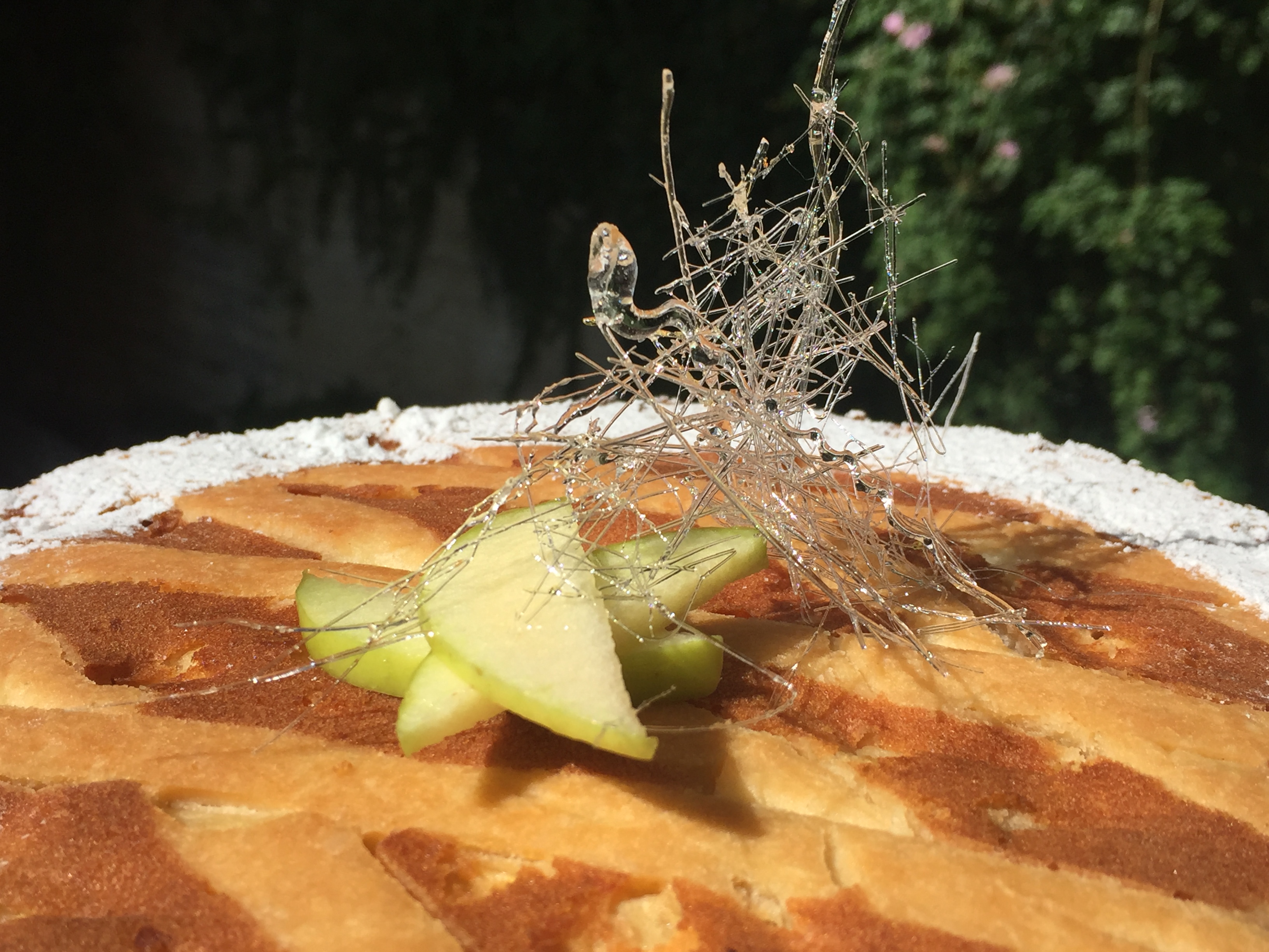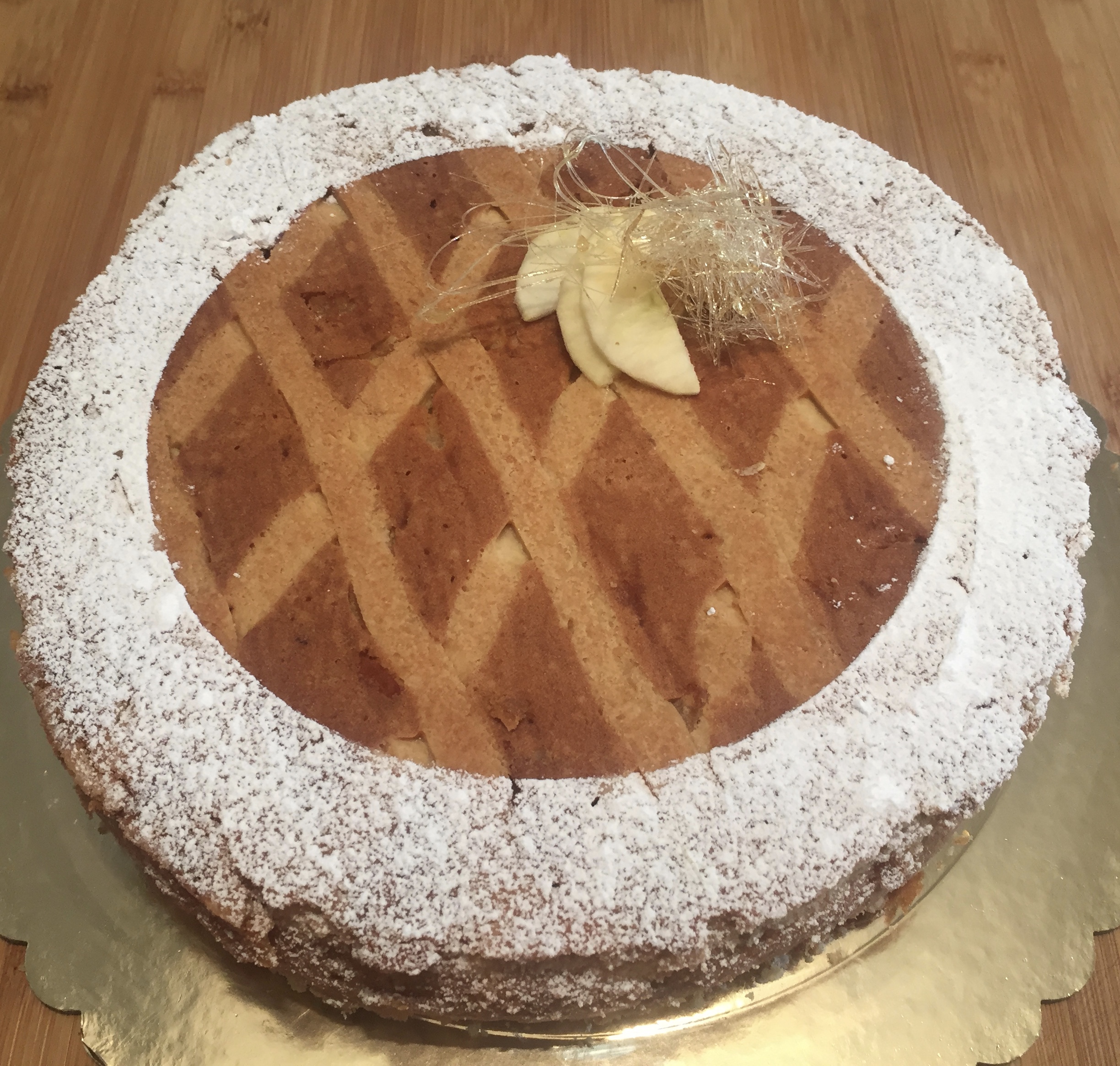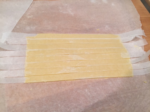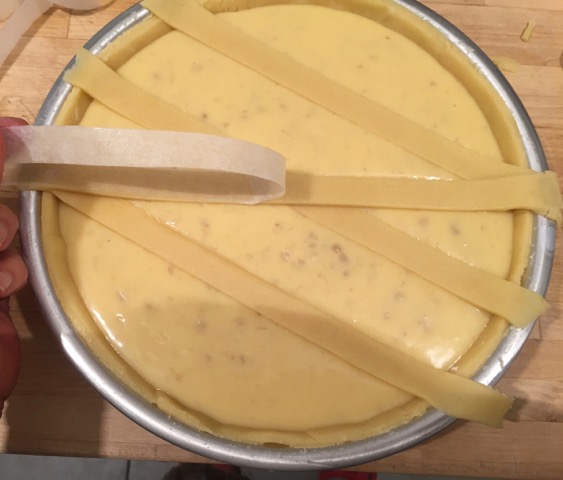 fatta la prima volta con anello di 26 cm. l’impasto era eccessivo, quindi stavolta ho usato due anelli uno di 24 ed un di 16 cm di diametro. Maria Grazia ha suggerito una griglia di pasta sablèe, che dà un po' croccantezza ed è molto carina a vedersi . Ho trovato una sablèe senza uova e la griglia l'ho fatta come al solito con le strisce di cartaforno