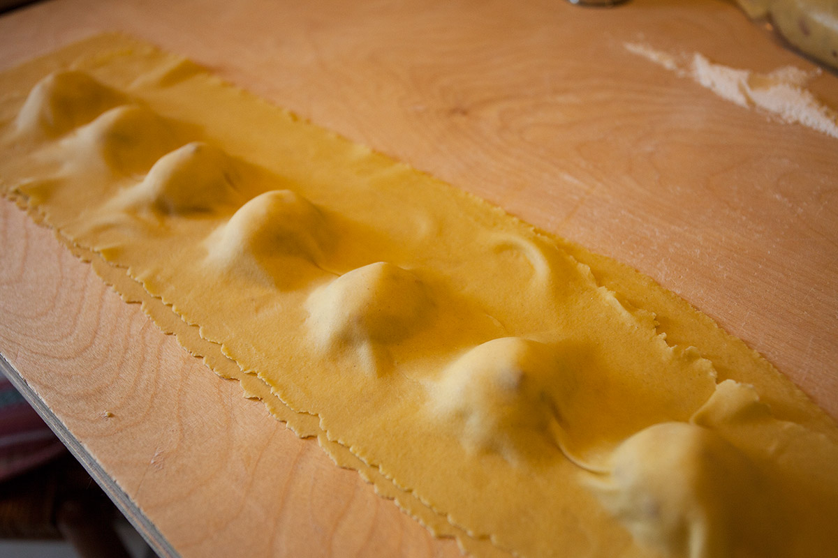 Riprendere il panetto di pasta e tirare delle sfoglie con l’Imperia all’ultima tacca. Formare dei ravioli ( io li ho fatti quadrati , ma qualsiasi altra forma va bene) mettendo in ognuno una cucchiaiata di farcia almeno delle dimensioni di una noce. Chiudere bene i ravioli cercando di evitare che rimanga all’interno dell’aria.
