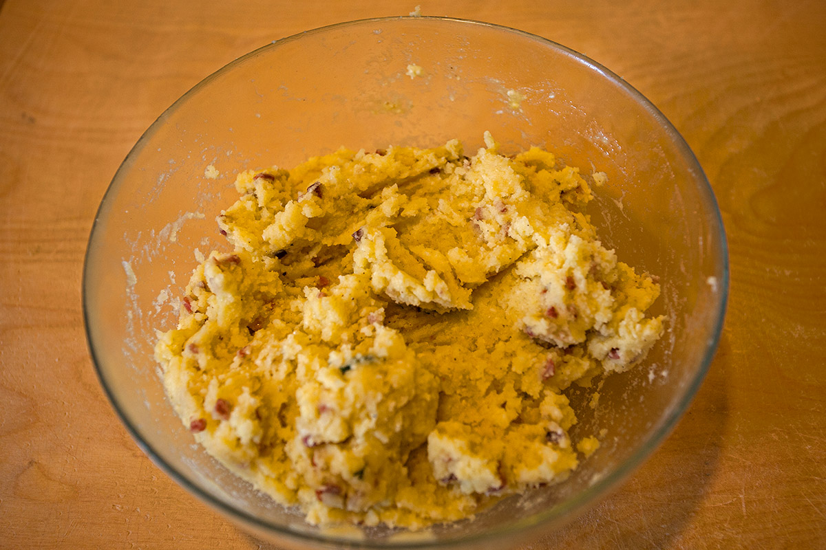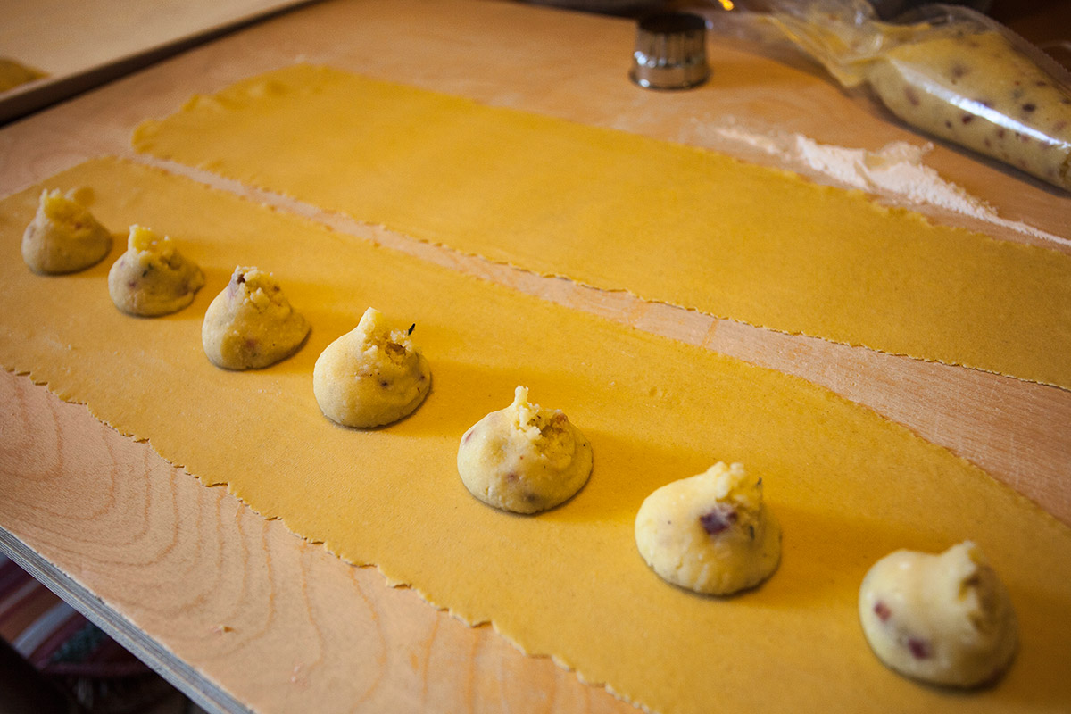 Preparare un panetto di pasta fresca con le solite dosi ( 50 gr di farina 00, 50 gr di semola, 3 tuorli d’uovo, 1 pizzico di sale e mezzo cucchiaio d’olio). Mettere in frigorifero a riposare almeno una mezz’ora. Intanto avviare la farcia: Tagliare in piccola dadolata lo speck e saltarlo in una padella dove avrete precedentemente fatto imbiondire in poco olio e una noce di burro ,uno spicchio d’aglio. Eliminate l’aglio e unite le patate bollite ancora calde dopo averle sbucciate. Schiacciarle bene con una forchetta e regolare di sale e pepe. Togliere dalla padella il composto e lasciarlo raffreddare in una ciotola aggiungendo anche un paio di cucchiai di parmigiano grattugiato, del prezzemolo tritato fine e una grattata di noce moscata.