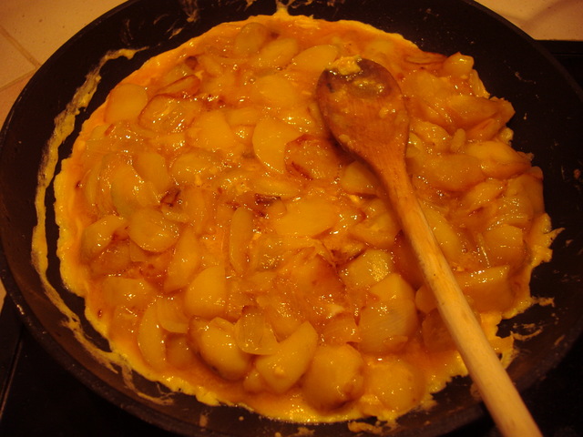 L'origine è sicuramente spagnola, ma non ce la metto nel titolo, dato che l'ho resa anche un po' portoghese....Per due persone ho sbucciato e affettato due patate medie e una piccola cipolla.Ho messo a cuocere le patate in olio evo (abbondantello) , le ho salate e ho aggiunto la cipolla e fettine di chourizo, una salsiccia portoghese leggermente agliata e leggermente affumicata.Poi ho scolato un po' dell'olio di cottura ed ho messo tre uova battute con sale e poco pepe...Ci abbiamo mangiato in due, ma se ce ne fosse stata di più...l'avremmo spazzolata.Metto le foto e, se ritieni che questo non sia il forum adatto...sposta pure Typone! :D