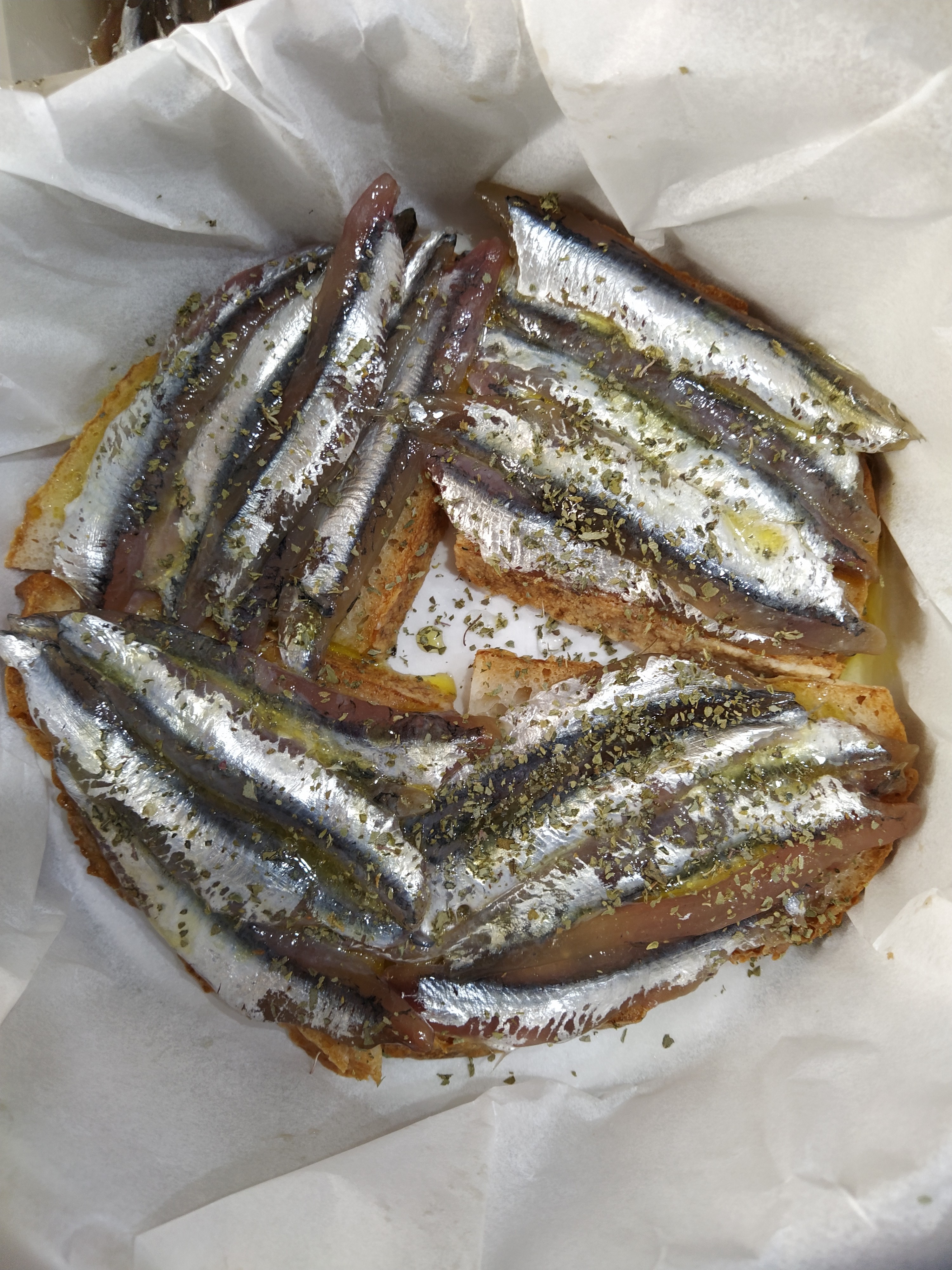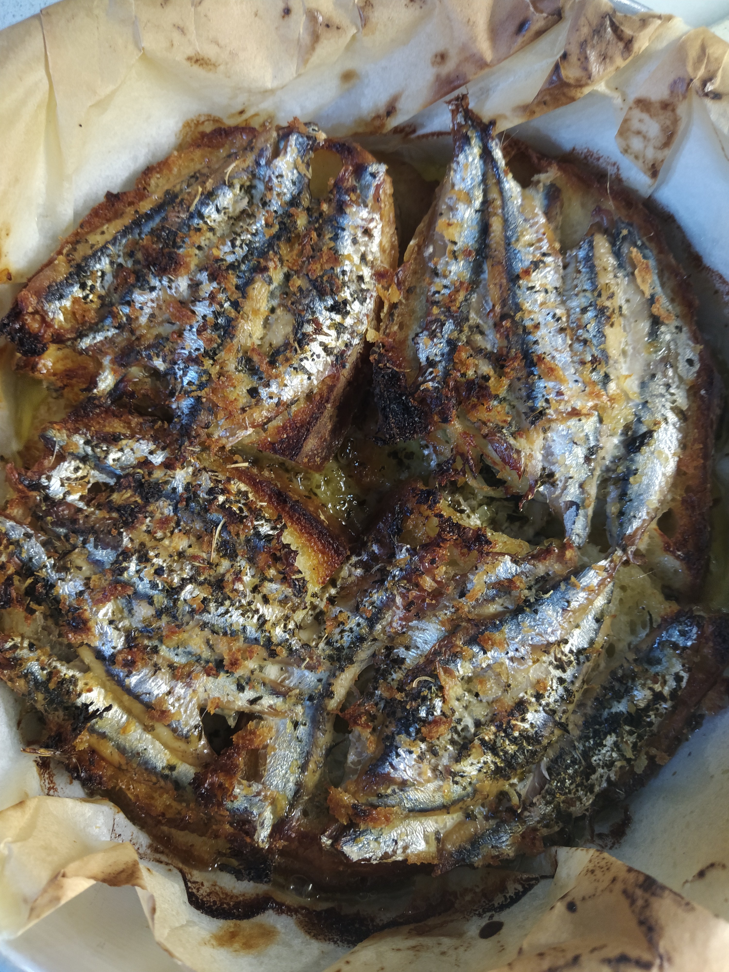 Io semplifico lo sporzionamento tagliando le fettine di pane della misura delle alici e sovrapponendo pane, alici in due strati ,emulsione olio sale e limone e origano.Di nuovo pane, alici in due strati e di nuovo condimento ed origano.termino con delle briciole di pane raffermo