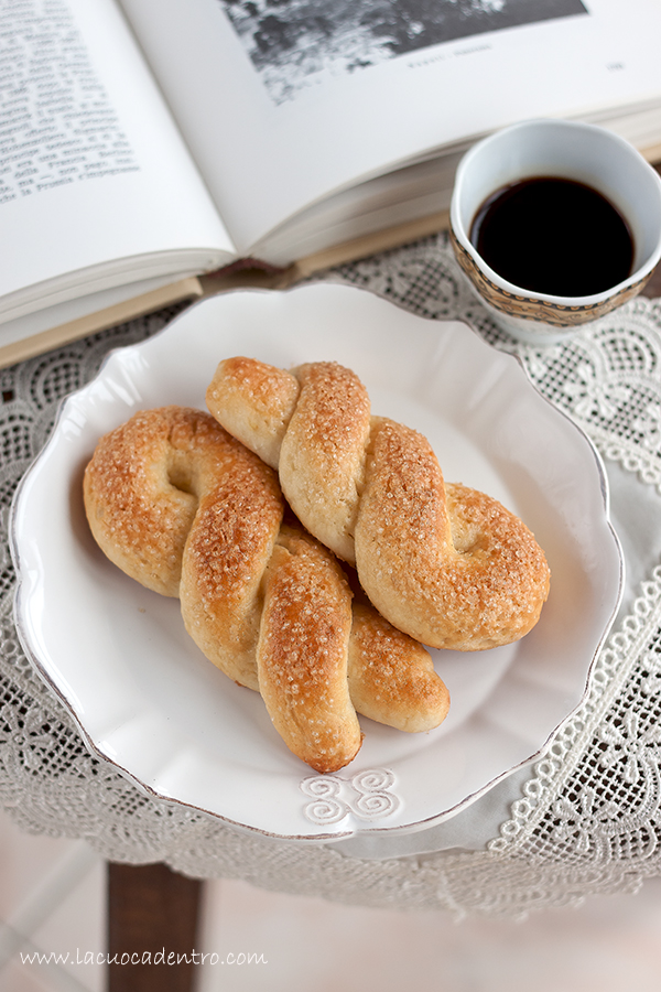 Eccole...ho messo meno zucchero, 180 gr. e oltre alla buccia di limone ho osato con una grattatina di zenzero fresco...lo avevo e ho provato...ci sta benissimo. Spennellato con latte e cosparso con poco zucchero semolato...quello di canna non l'avevo.