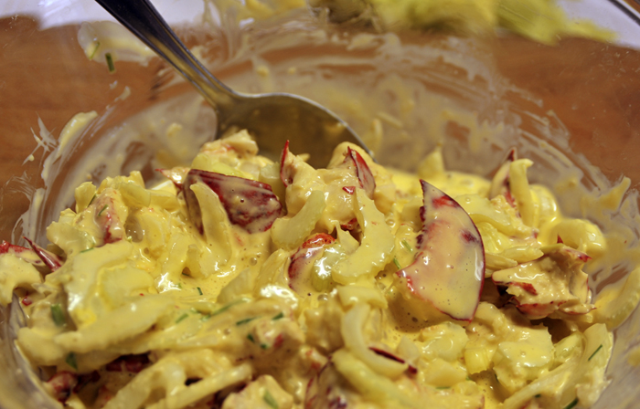 Ho preparato la polpa di astice bollita in una terrina con maionese, con l'aggiunta di cuore di sedano ed erba cipollina.