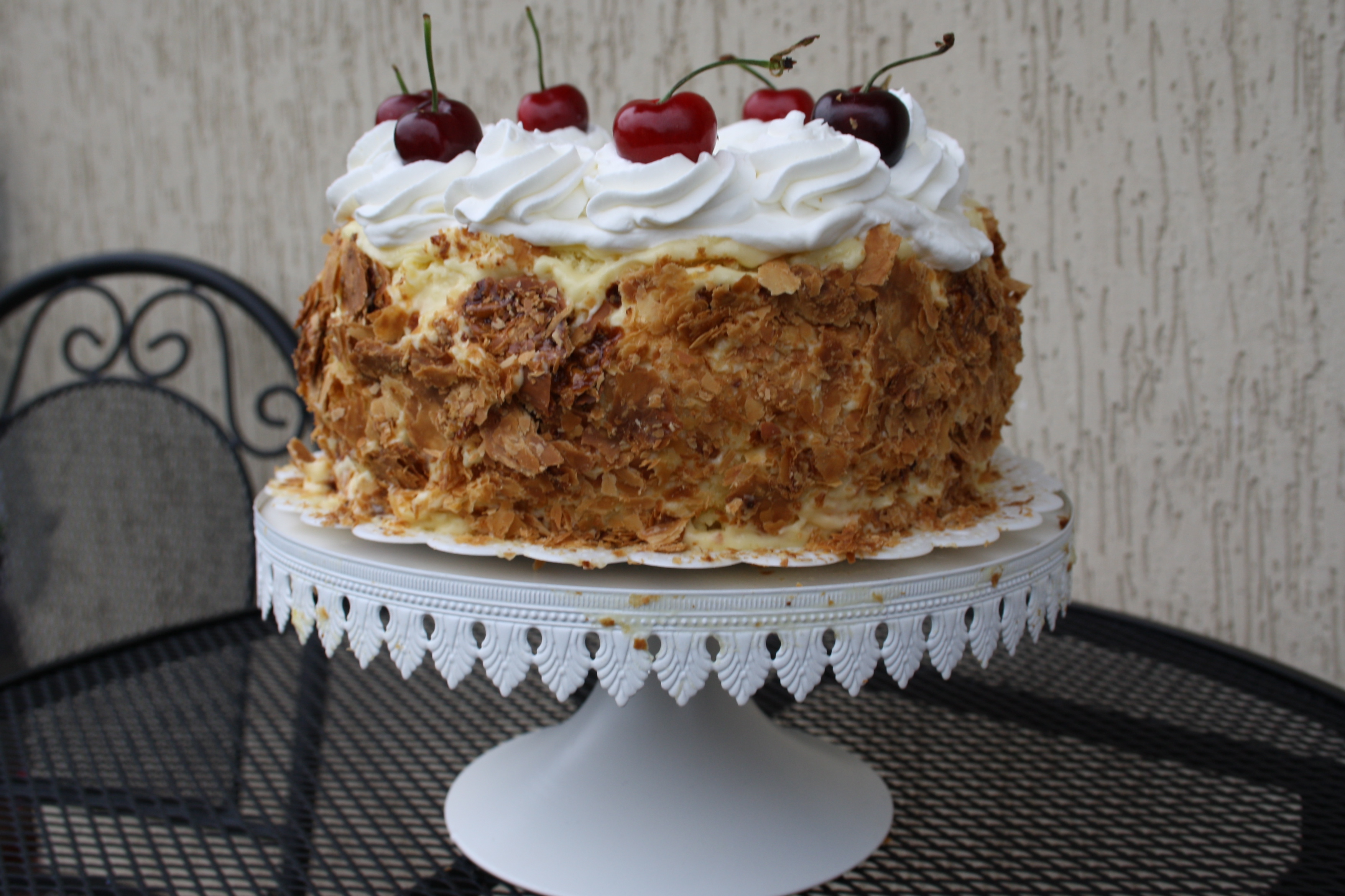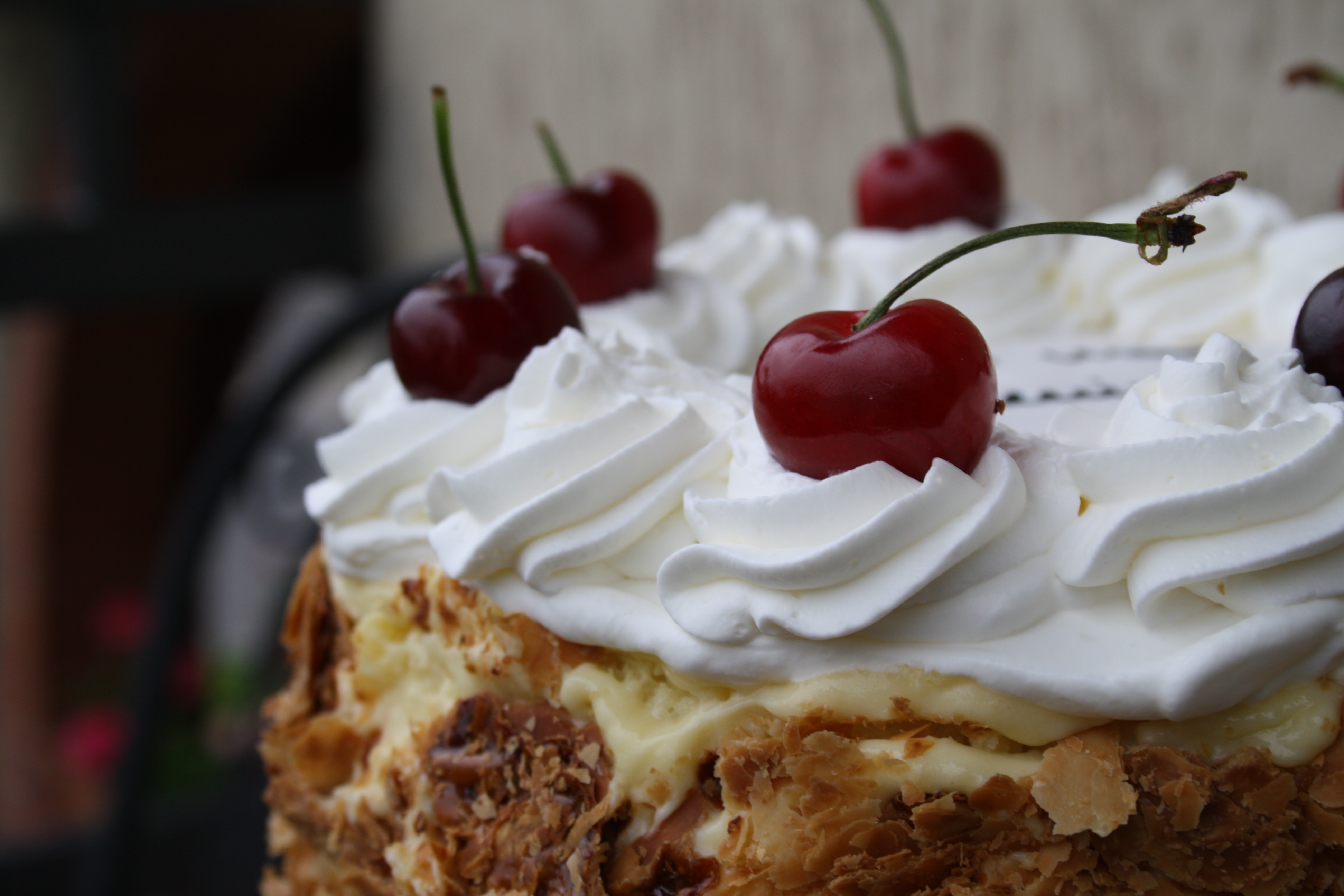 - PANNA MONTATA, PASTA SFOGLIA CARAMELLATA (ottenuta cuocendo la pasta sfoglia con zucchero a velo a circa 240' per 10-15 minuti) e CILIEGE per guarnire...
