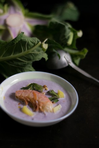 A questo punto avete varie scelte: servirlo così, molto semplicemente; aggiungere qualche tocchetto di patata lessa, qualche gheriglio di noce e il prezzemolo; aggiungere qualche coda di gamberone precedentemente scottata.