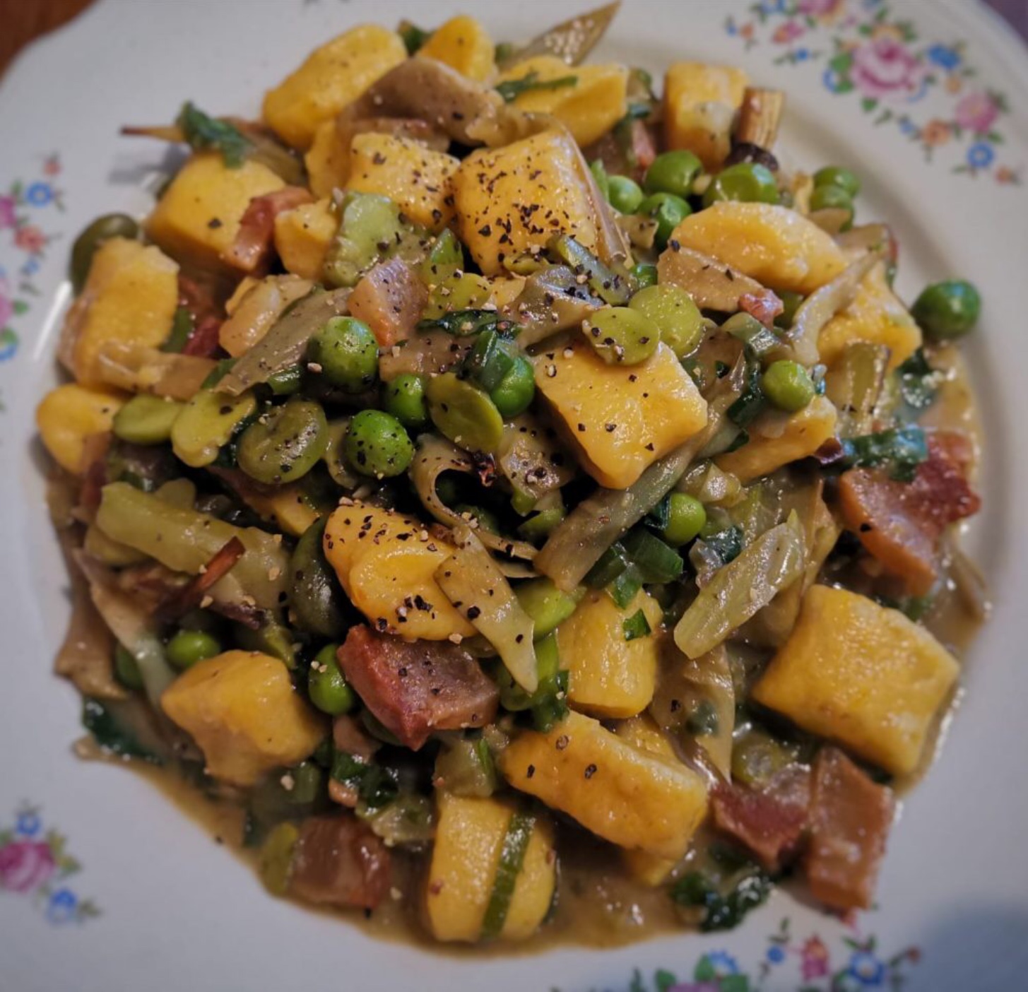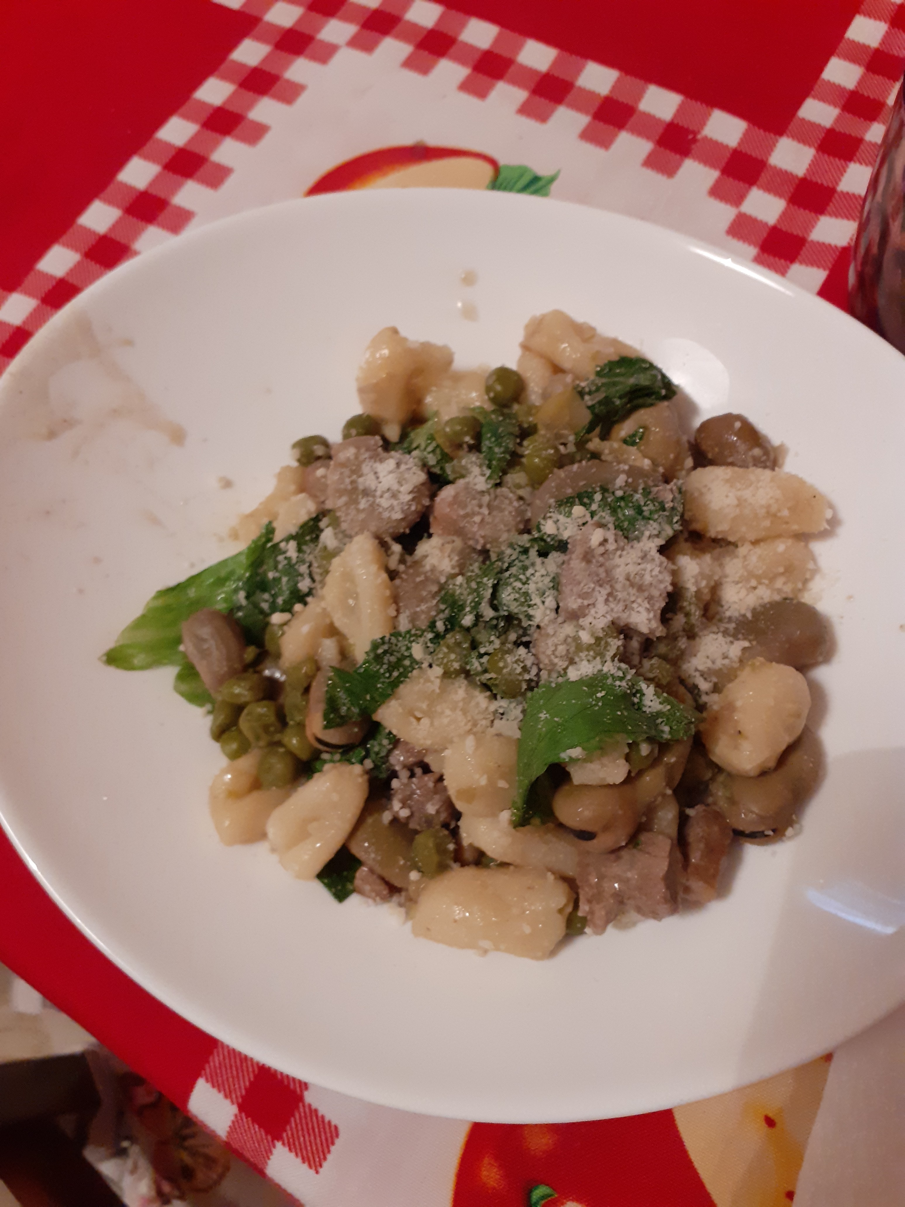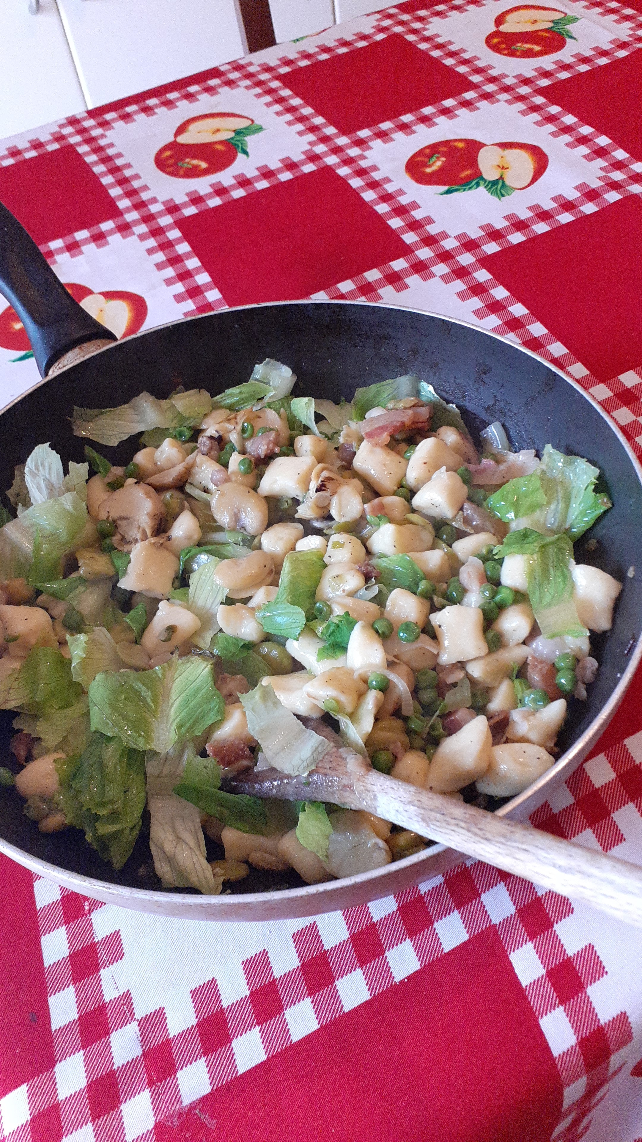 siccome domenica ho trovato le fave per i piselli ci vuole un altro po ho fatto gli gnocchi di patate stamane ma almeno un piatto che sa di primavera come la giornata di oggi