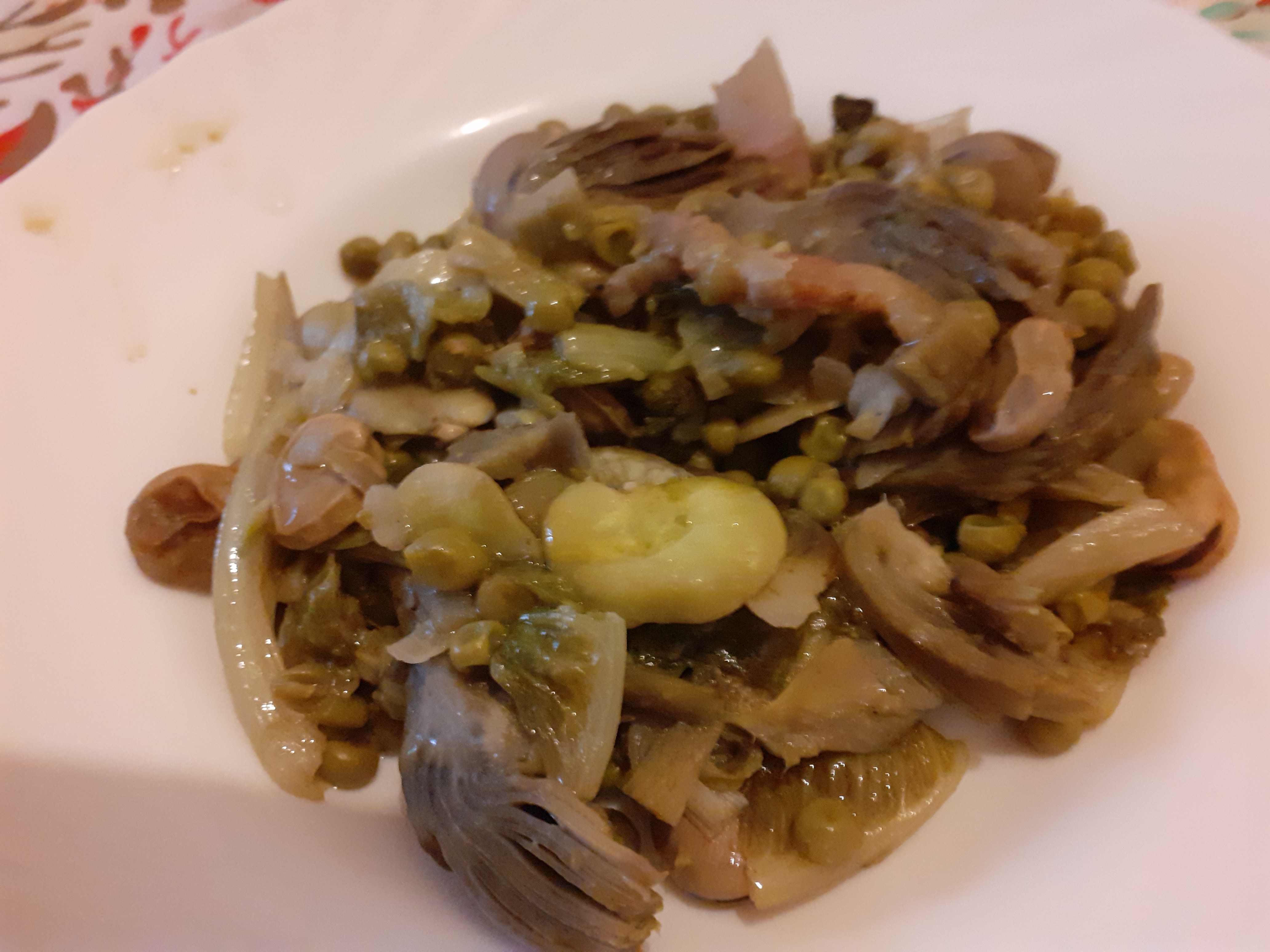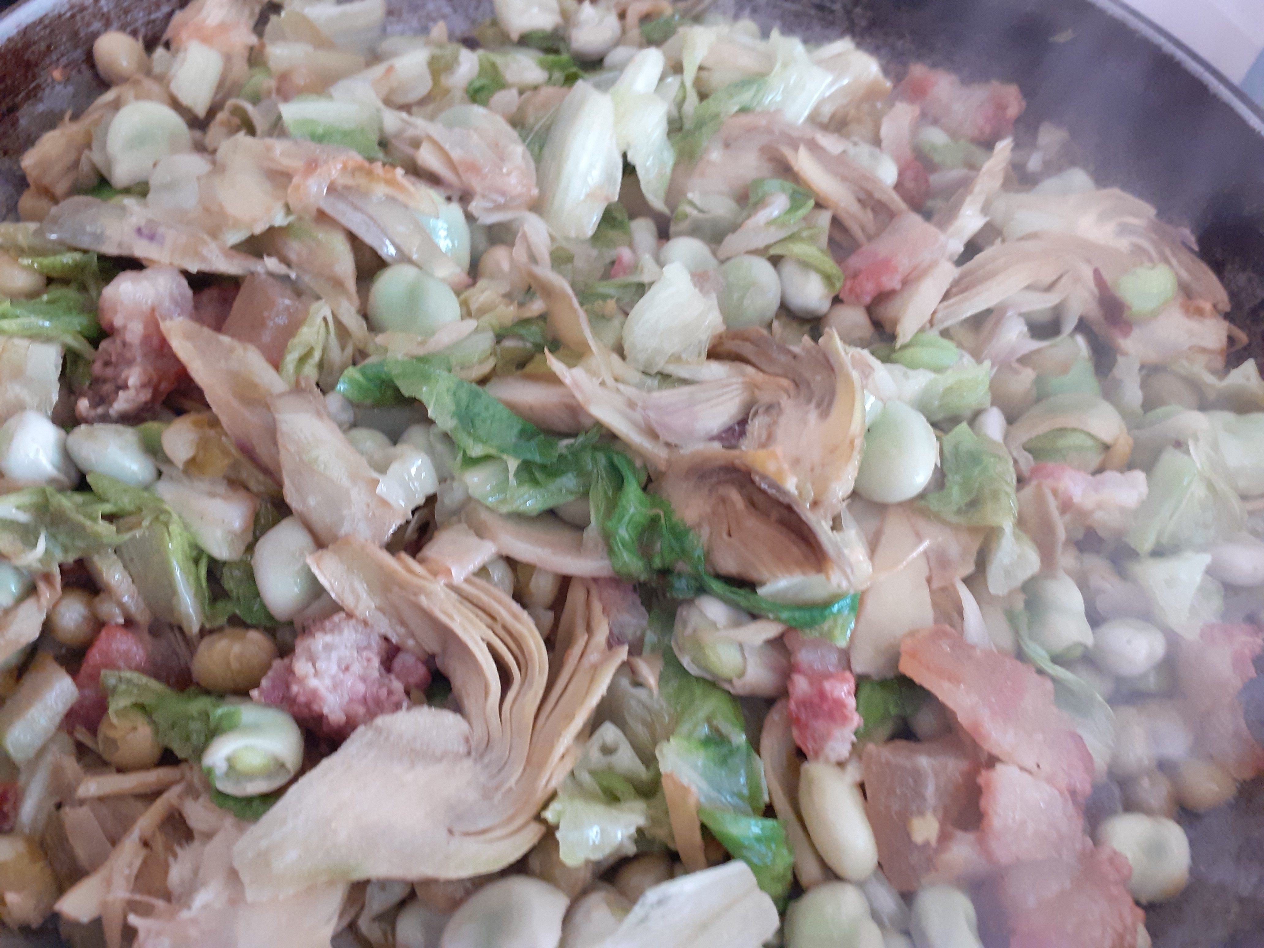 Piatto tipico della primavera romana, contadino e profumatissimo: la Vignarola unisce fave, piselli, carciofi, cipollotti e guanciale in un'esplosione di sapori stagionali.