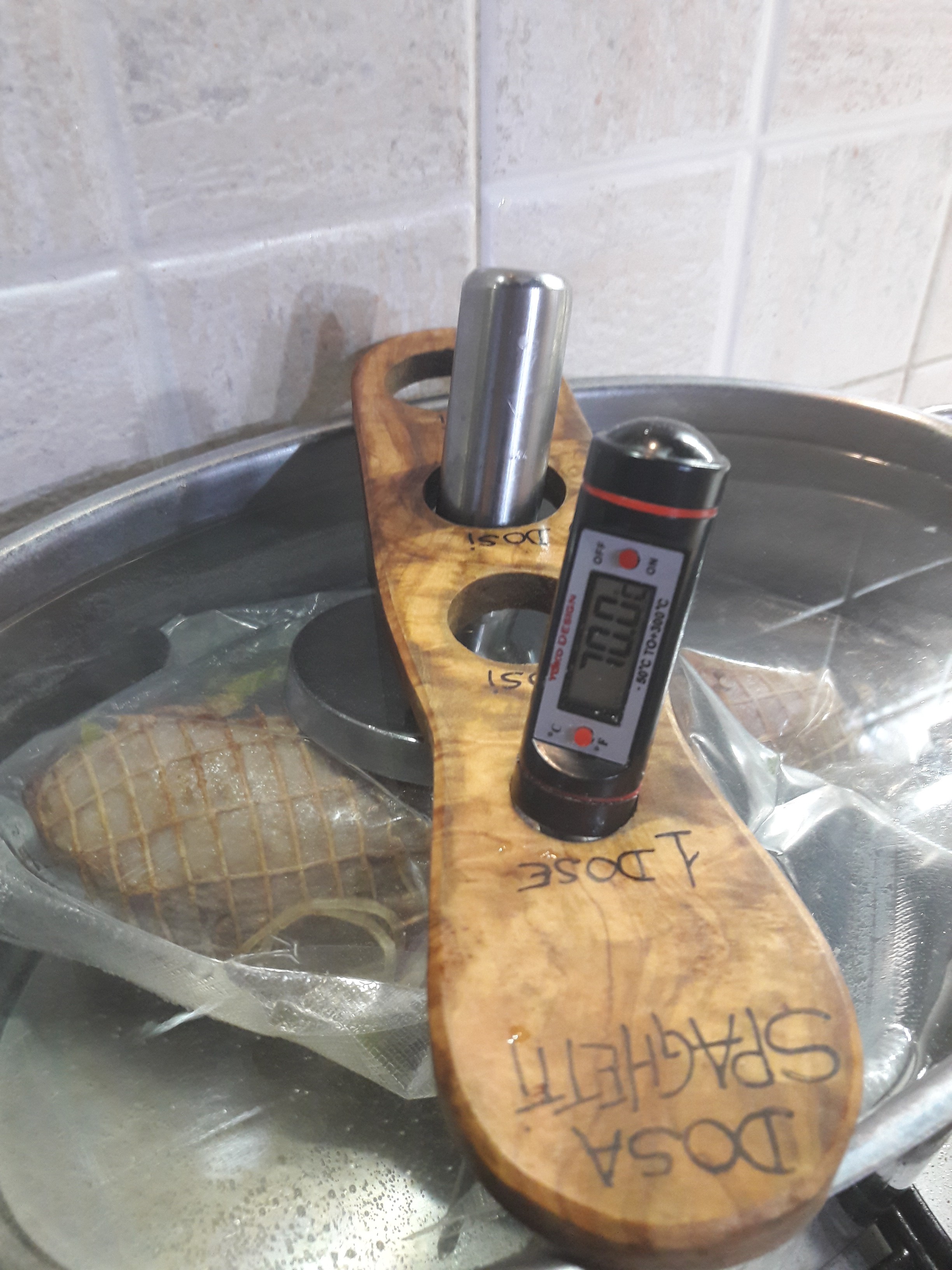 Mettere in una capace pentola con acqua a 70° costanti, che lo tenga bene immerso per almeno 3 ore.